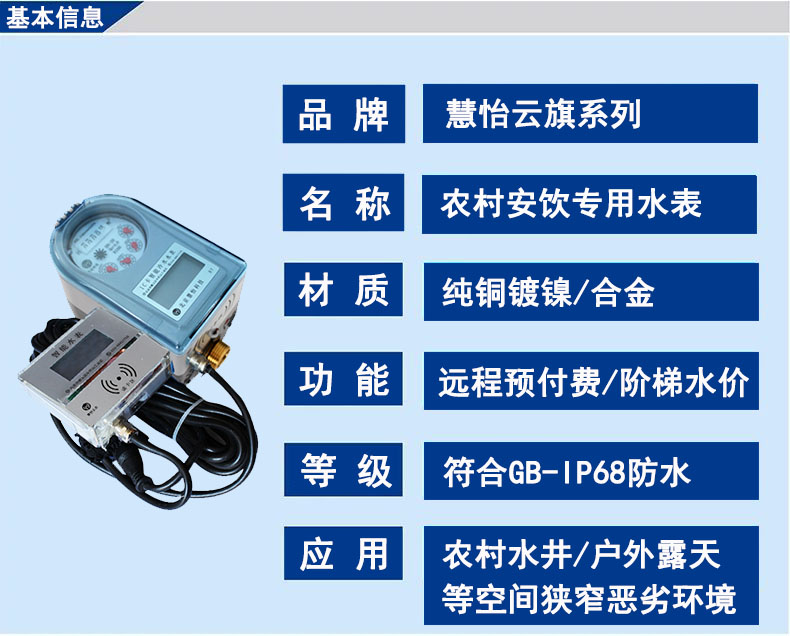 农村安饮防水智能水表是慧怡水表厂家针对一些恶略计量环境(农村水井、农村安装位置狭窄、安装位置不易观看、水下、露天自然环境、深井、管道井等等)而开发的一种水表,可以实现井下(水下)安装,井上(水上)操作,具备IP68国标防护标准,在恶略环境之下可稳定、准确的计量,为老百姓解决了长期浸泡、长期潮湿环境等计量工作的难题。我公司云旗系列产品包括:NB物联网远传水表、LoRa远传水表、蓝牙水表、一体式水表)是由北京慧怡科技针对农村水井环境、表具安装位狭窄不宜观看环境、室外露天井中等环境,设计理念是将智能水表的显示及数据读写模块、水表控制模块、防水电池等各部件安装在防水盒内,悬挂置井边或墙壁,其基表部分安装在井下,防水性能非常好,农村安饮防水智能水表采用双CPU的模式,将电子模块分为表头和控制器两个部分,表头部分安装在井下,完成水表的计量,数据存储和阀门控制,控制器部分完成卡片的读写操作、显示以及逻辑判断功能。