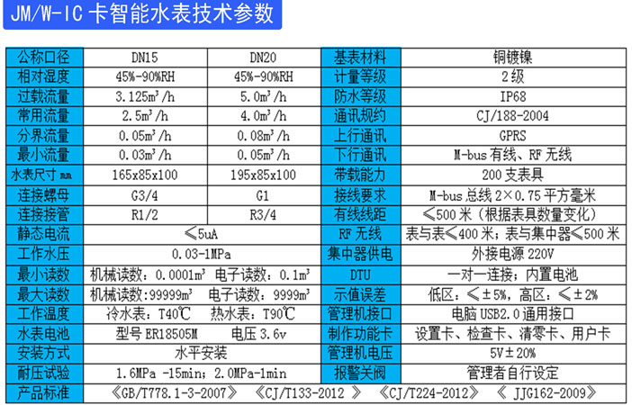 智能磁卡水表是以微电脑控制技术为核心,以智能卡为信息传递媒介而构成的高科技机电一体化智能仪表,具有机械计数和电子计数的双重功能。智能磁卡水表主要由智能卡读写器、低功耗微电脑、新型电机阀、流量采集及相应电路组成,在保持了传统机械式水表的特点的同时,还具有直观的电子显示。 1. 非接触智能磁卡水表,数据IC卡进行传输,防水防潮。卡表通讯非接触。有效的防止了人为的破坏和卡口的机械牢损。 2. 采用高能锂电作为电源,微功耗设计,使用寿命更持久,并且电池可更换。有效的保证了水表的可靠运行。 3. 阀表一体基表,湿式水表机芯,计量更准确。电动球阀,工作可靠无压损,电机全密封。 4. 整表电路灌封设计,防水防潮防水淋,非常适合恶劣环境条件下使用。无外漏电极。 5. 保密性强,无线数据交换,密码不可破译。 6. 设计齿轮箱,开关阀扭矩大,保证可靠关阀。 7. 字轮和LCD双显示。产品计量更可靠,更稳定,计量可信性更高。
